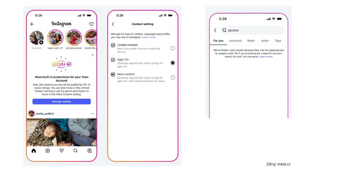 Meta zavádí na Instagramu nová pravidla pro teenagery – účty uživatelů ve věku 13 až 18 let se nově řídí hodnocením PG-13, podobně jako filmy pro mladší publikum. Teenageři tak uvidí jen obsah bez vulgarit, nebezpečných výzev nebo škodlivých témat. Účty mladších 18 let se na tuto úroveň přepnou automaticky a rodiče mohou navíc zapnout ještě přísnější režim. Nová pravidla zároveň omezují vyhledávání citlivých výrazů i interakce s problematickými účty a postupně se zavádějí po celém světě.